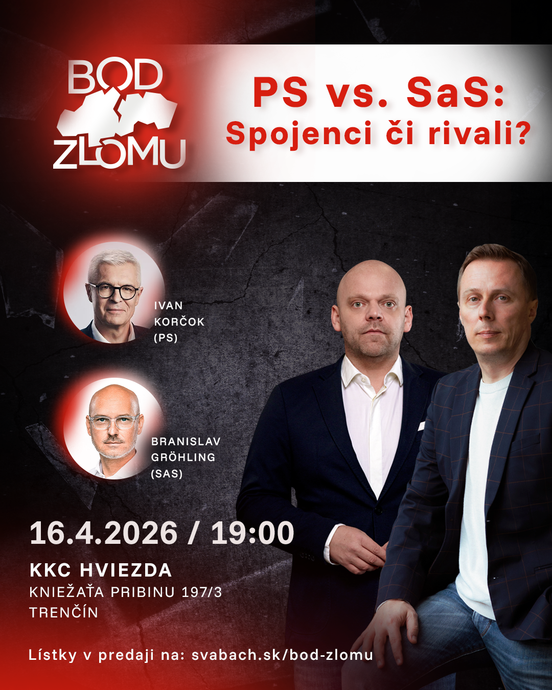 📍 Príďte 16. apríla 2026 o 19:00 do KKC Hviezda v Trenčíne a dozviete sa viac. Hosťami Mareka Vagoviča a Richarda Dírera v talkshow Bod zlomu budú – Ivan Korčok (PS) a Branislav Gröhling (SaS).